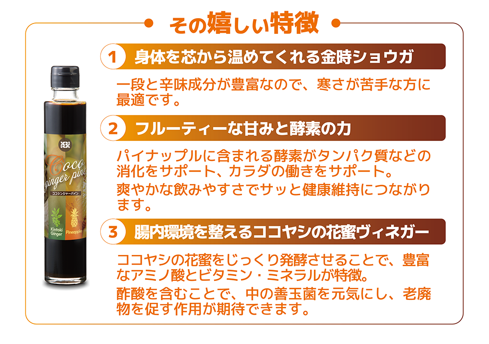 この度の「ココジンジャーパイン」は、ココネクタスに金時ショウガとパイナップルを組み合わせた、さらに贅沢なドリンクです。