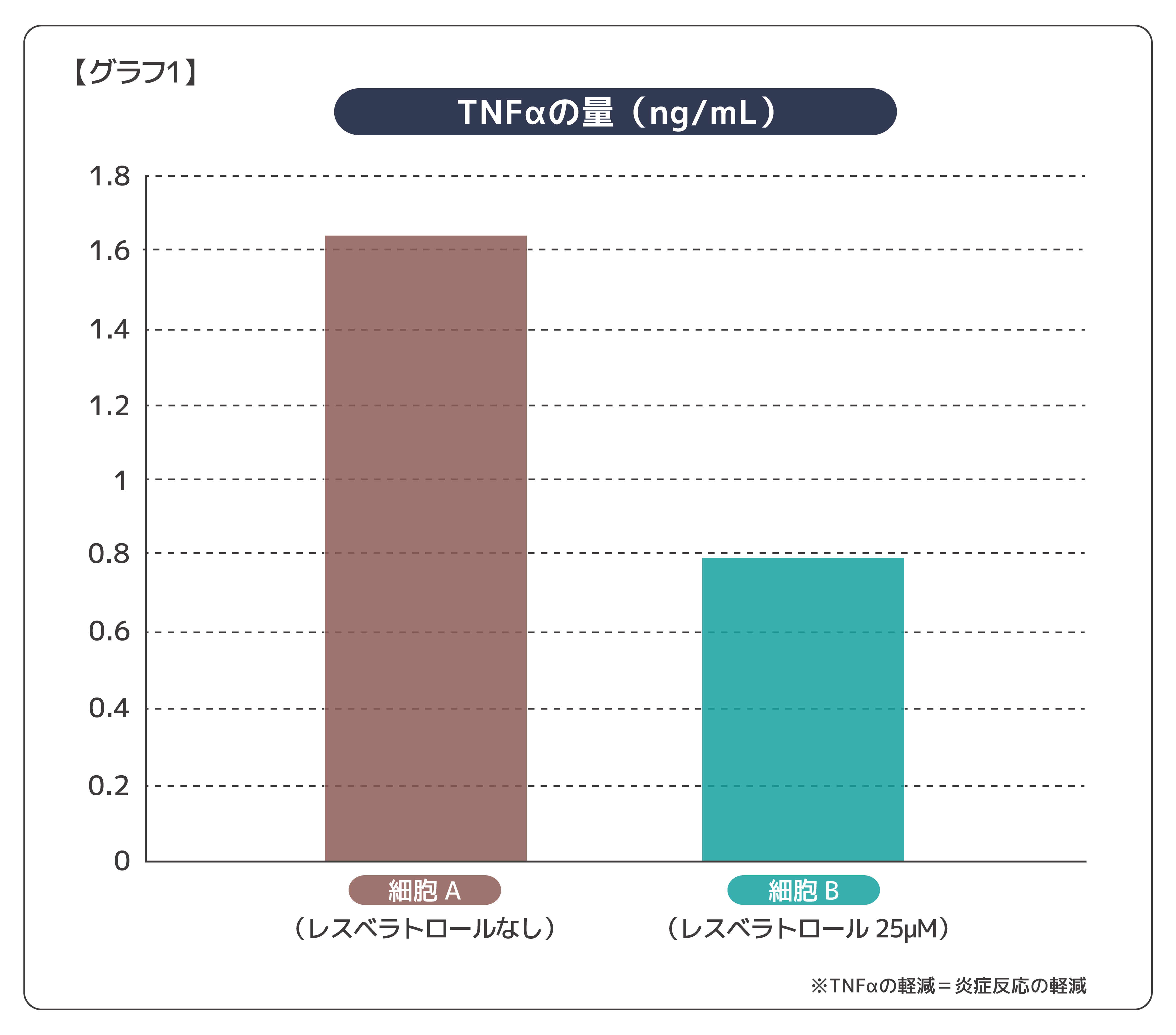 レスベラトロールを投与した細胞Bでは、mCRPによって誘発されたTNFαの放出が有意に抑制される可能性が示唆されました。(グラフ1参照)