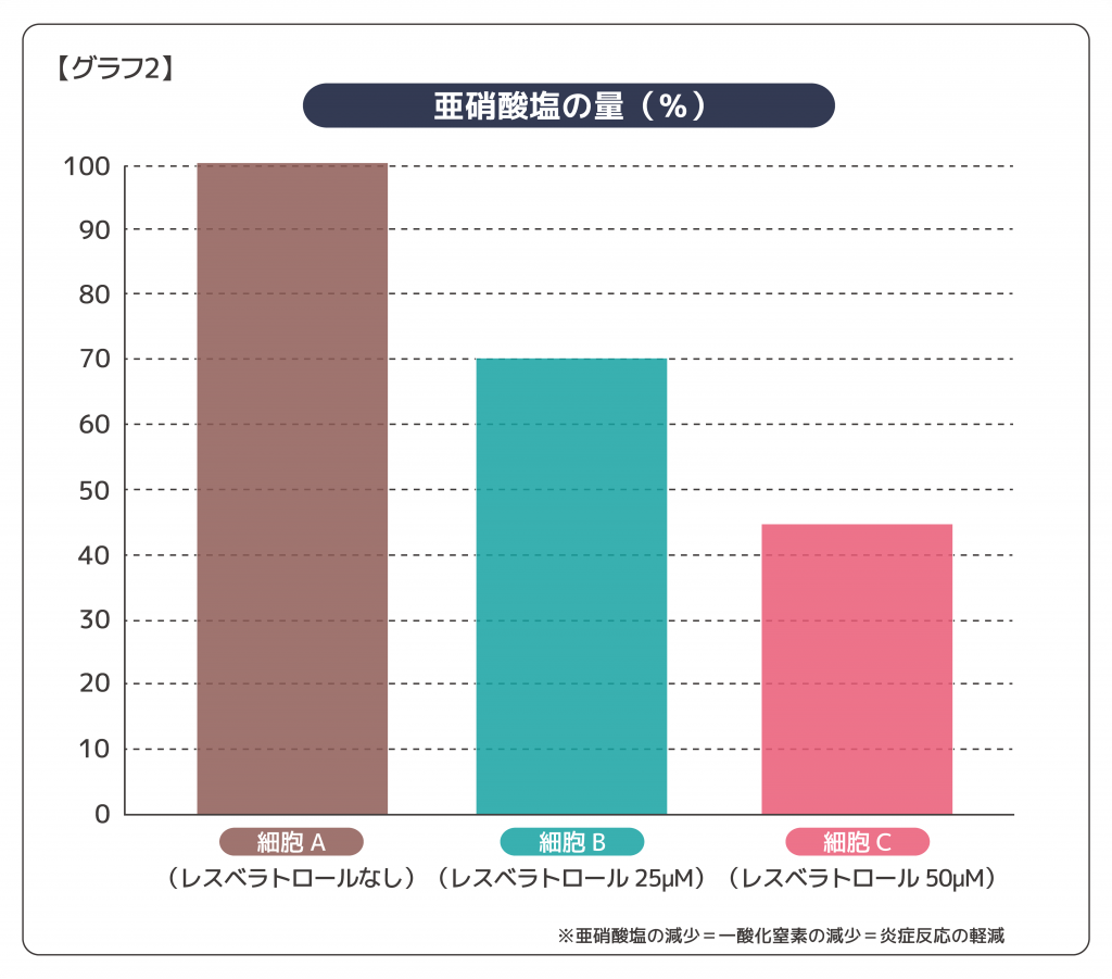 レスベラトロールを与えた細胞BおよびCでは、亜硝酸塩の量が有意に減少しました。(グラフ2参照)