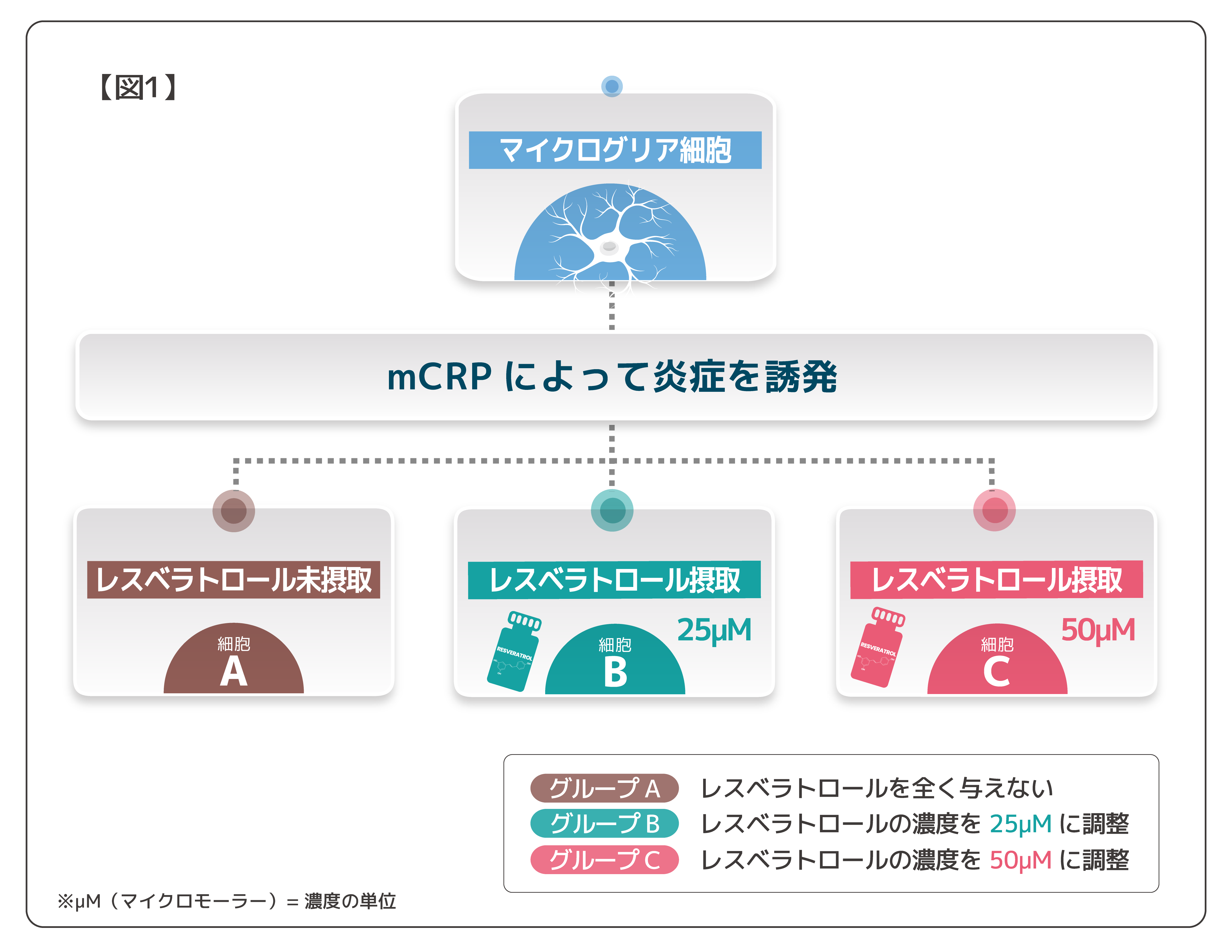マイクログリア細胞にmCRP(C反応性タンパク質)を与えて炎症反応を誘発し、レスベラトロールを与えて3つのグループに分け、それぞれの炎症反応を調査しました。(図1参照)