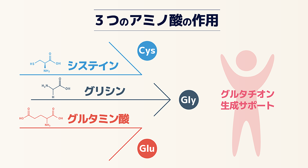 グルタチオンは、細胞を還元パワーでサポートし、体の若々しさを維持する決め手となる物質。しかし、年齢とともに減少し、自然に補うことが難しいのが現実です。 そこで「ココワスレン」は、 システイン・グリシン・グルタミン酸という3つのアミノ酸を高濃度で配合することで、体の中で自然にグルタチオンを作り出せるようサポートし、細胞レベルの健康を促す仕組みを整えました。