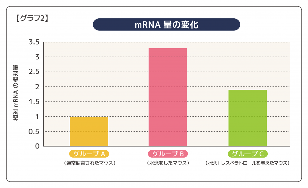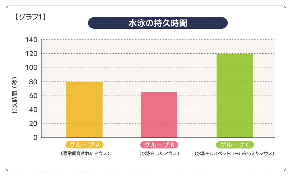 グループBは、疲労により持久力が下がっているのに対し、レスベラトロールを与えたグループCは、基準値であるグループAの記録を上回るほどより長く泳ぎ続けることができ、持久力が向上したことがわかりました。(グラフ1参照)