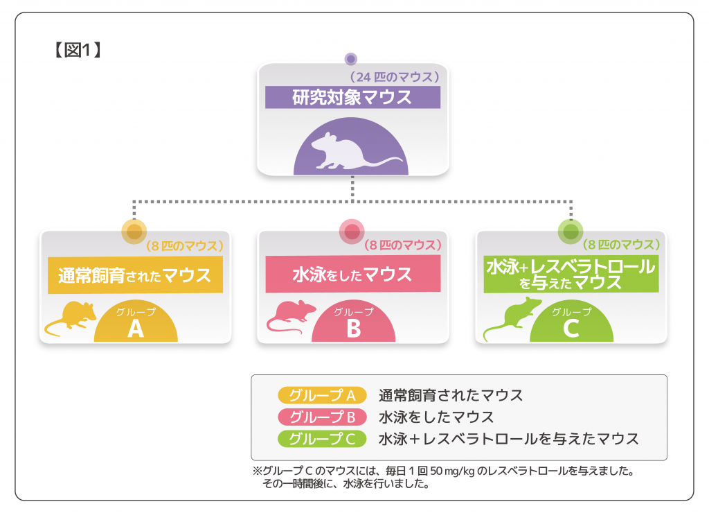 マウス24匹を対象に、通常飼育されたグループ、運動をしたグループ、そしてレスベラトロールを摂取しながら運動をしたグループの3つのグループに分けられました。