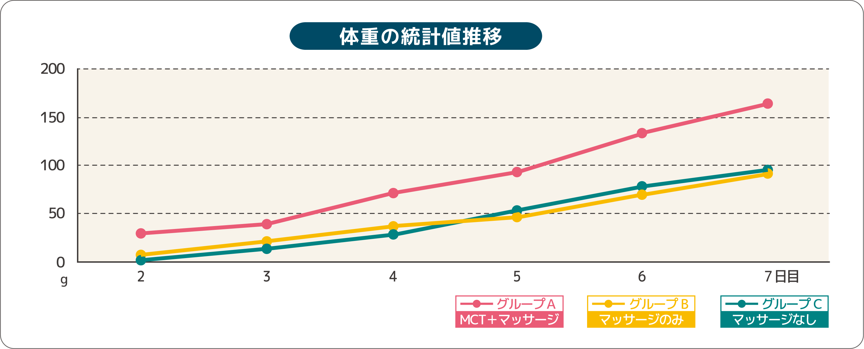 MCTオイルでマッサージをしたグループAはグループB、Cと比較して、有意な体重増加が確認されました。(表1参照)