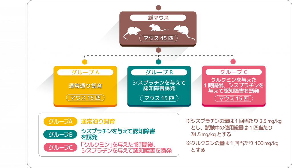 今回の研究は中国にある華僑大学の協力の元、計30日間にわたり実施され、雄のマウス45匹を対象として下記のようにグループ分けを行いました。 (図1参照)