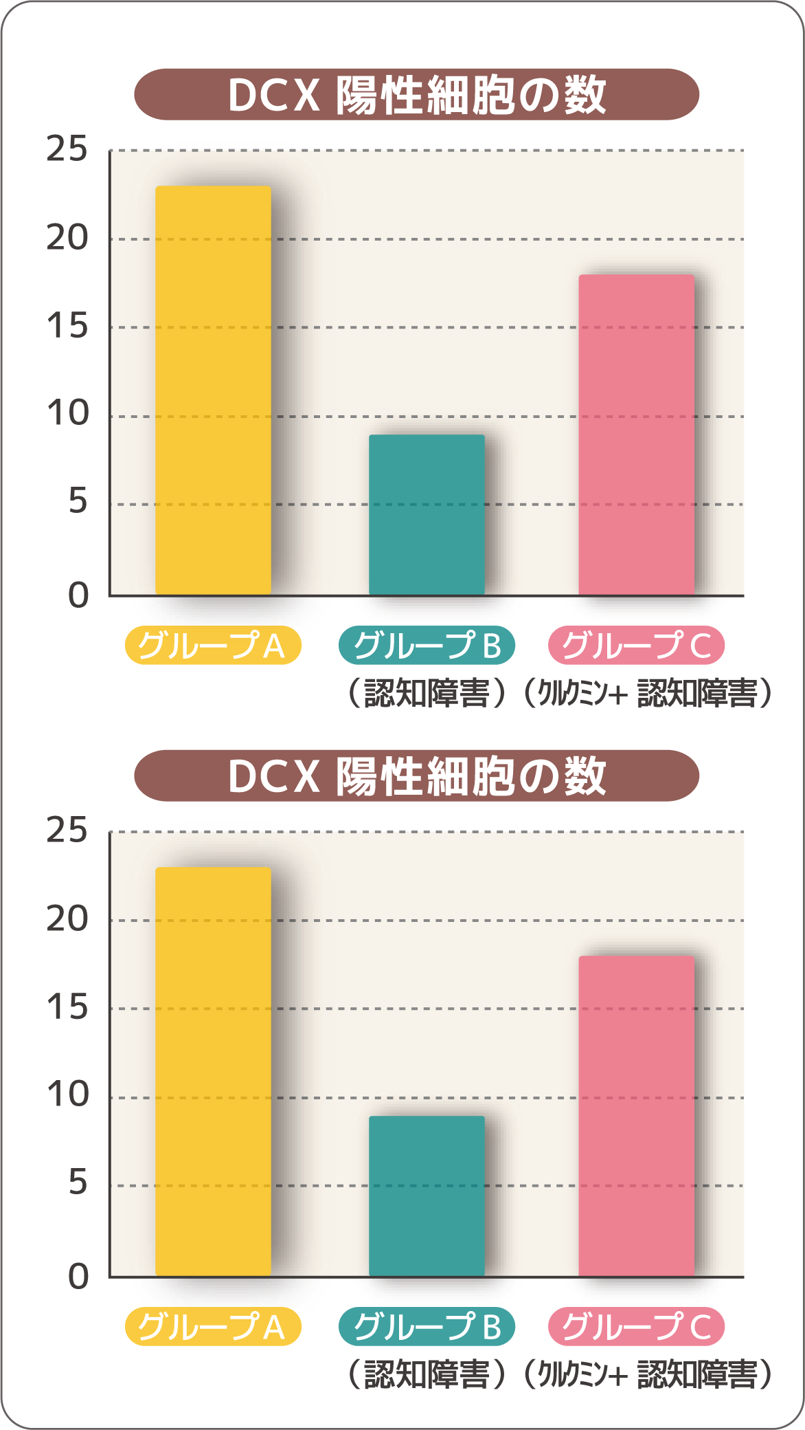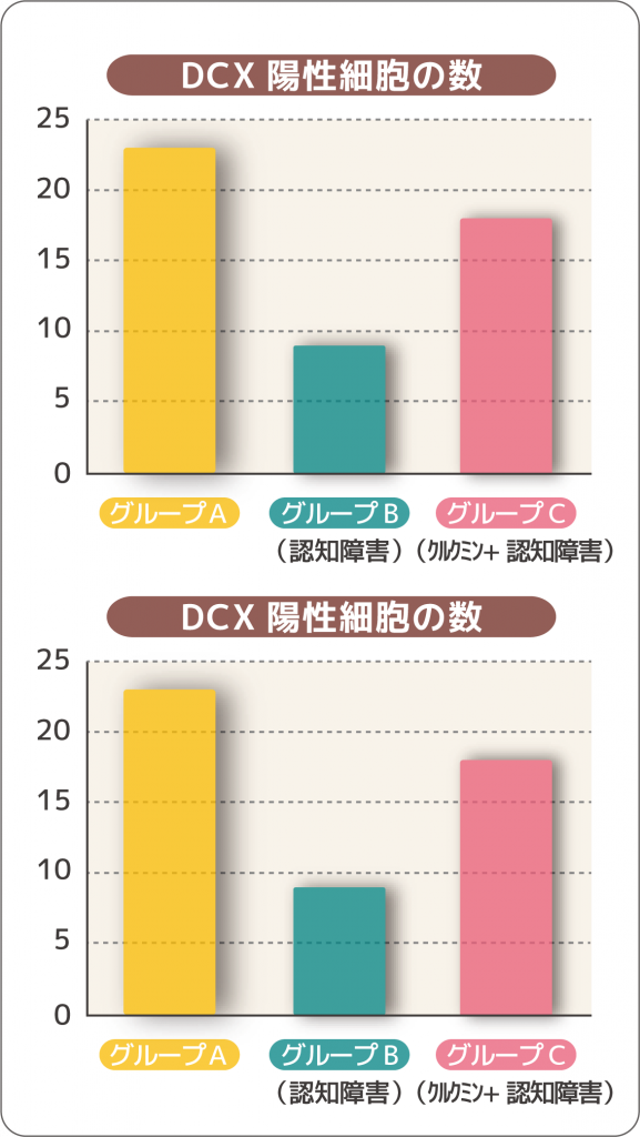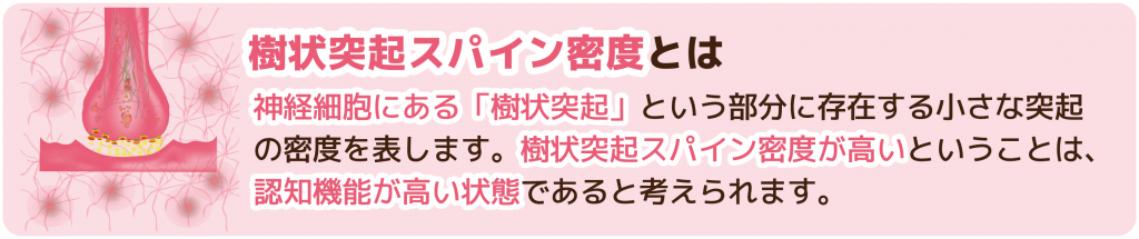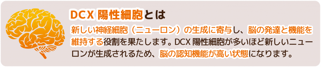 評価項目として、➀DCX陽性細胞の数、②脳の記憶や学習を司る海馬(かいば)の樹状突起スパイン密度を計測しました。